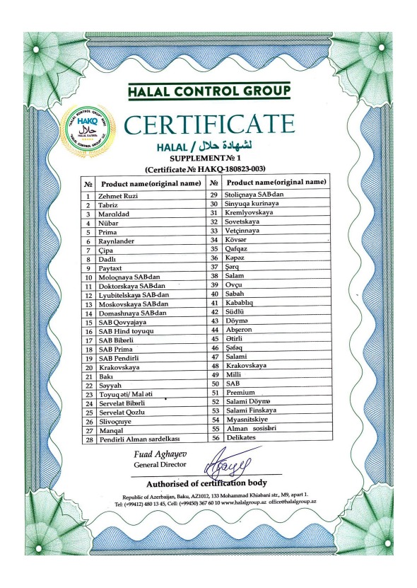 "SAB" daha bir uğura imza atıb. "SAB" məhsulları Halallıq standartlarına uyğun olduğuna görə beynəlxalq Halallıq Sertifikatı ilə təltif edilib.Bildiyiniz kimi, hazırda Azərbaycanın ət və ət məhsulları bazarında müxtəlif adda və çeşiddə kolbasa və sosislər istehsal olunur. Son zamanlar isə kolbasa və sosislərin halal olub-olmaması ilə bağlı müxtəlif ziddiyyətli fikirlər ölkə gündəmində səsləndirilir. Belə ki, halal kolbasa və sosislərin hazırlanması zamanı lazım olan ətin haradan gətirilməsi, Azərbaycanda bu standartlara uyğun fəaliyyət göstərən şirkətlərin olub-olmaması əhali arasında müəyyən mənada şübhə və çaşqınlıq yaradır.