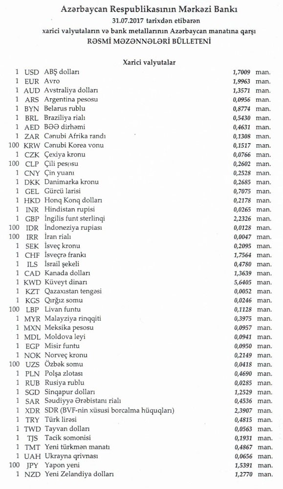 İyulun 31-nə Mərkəzi Bankın açıqladığı rəsmi Dollar/manat məzənnəsi İyulun 28-i ilə müqayisədə dəyişməyərək 1,7009 manat olub, Avro/manat məzənnəsi isə 1.9963 manata qalxıb.