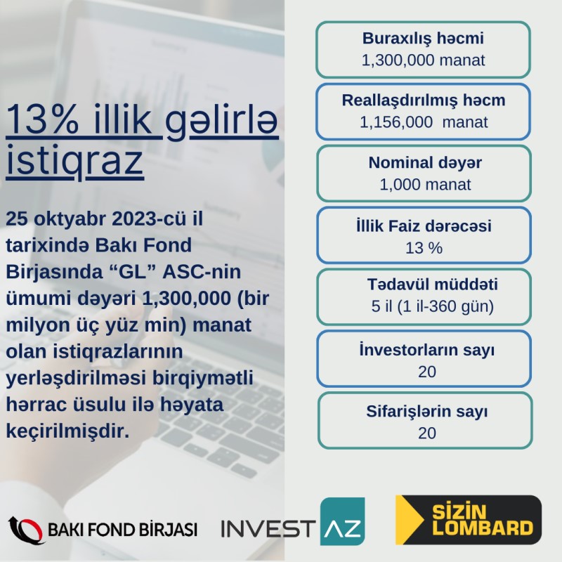 25 oktyabr 2023-cü il tarixində Bakı Fond Birjasında “GL” ASC-nin tədavül müddəti 5 il (1 il-360 gün) təqvim günü, nominal dəyəri 1 000 manat olan AZ2012020288 dövlət qeydiyyat nömrəli, 1,3 milyon manat həcmində olan, faizli, təmin edilməmiş sənədsiz, adlı istiqrazlarının yerləşdirilməsi üzrə hərrac yekunlaşıb.