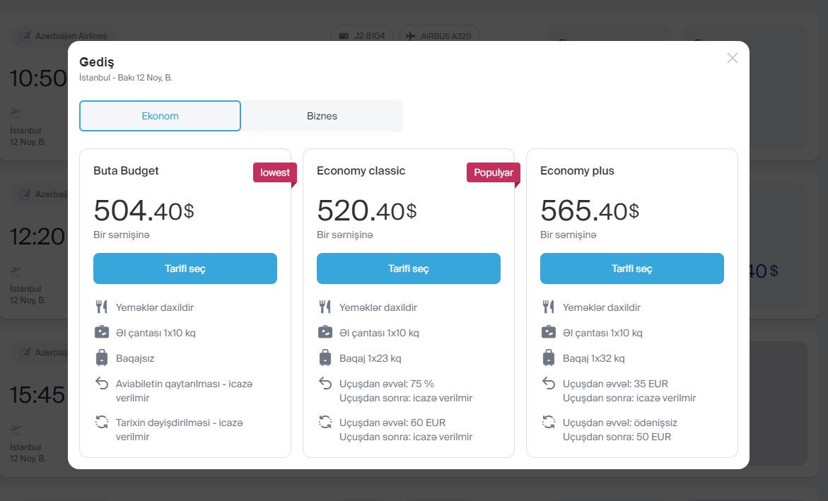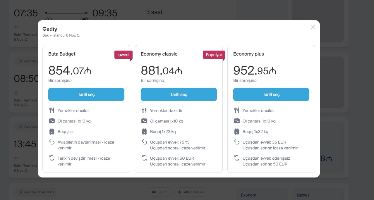 Qısası, 1 nəfər 8 noyabrda İstanbula gedib, 12 noyabrda Bakıya qayıtmağı planlaşdırsa - baqajsız yer üçün 1711 manat, baqajlı yer üçün 1915 manat ödəməlidir. Gediş və qayıdış biletini eyni anda alsanız qiymətlərə cüzi endirim olur.