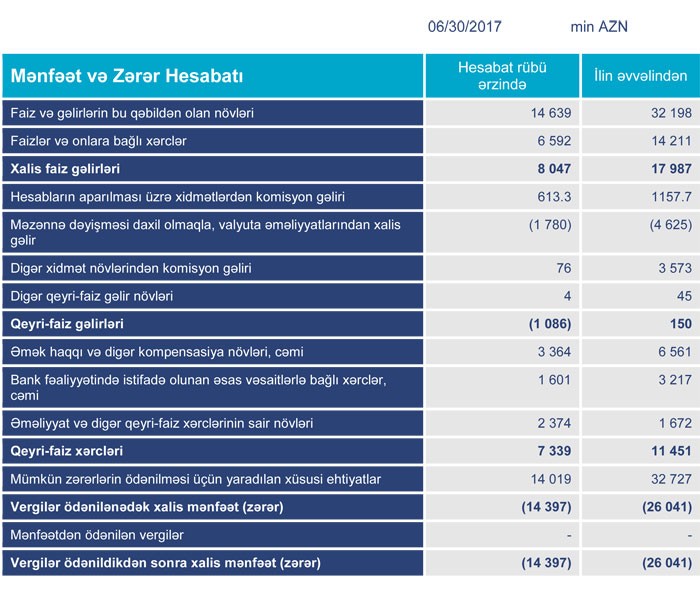31 Mart 2017-ci il tarixində Bankda Mərkəzi Bankdan alınmış kreditlər 60 milyon manat idi.