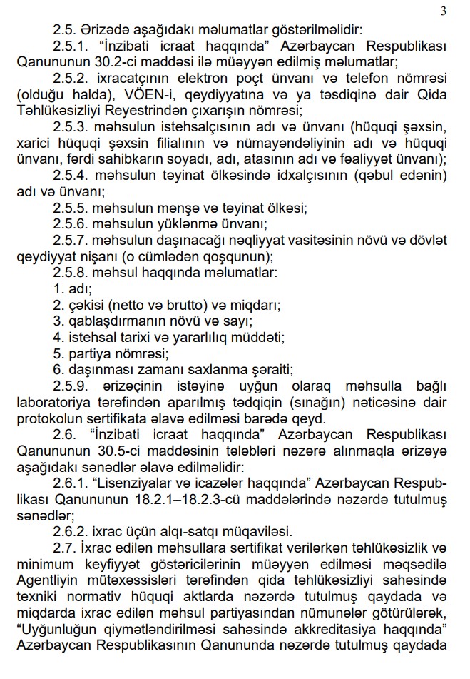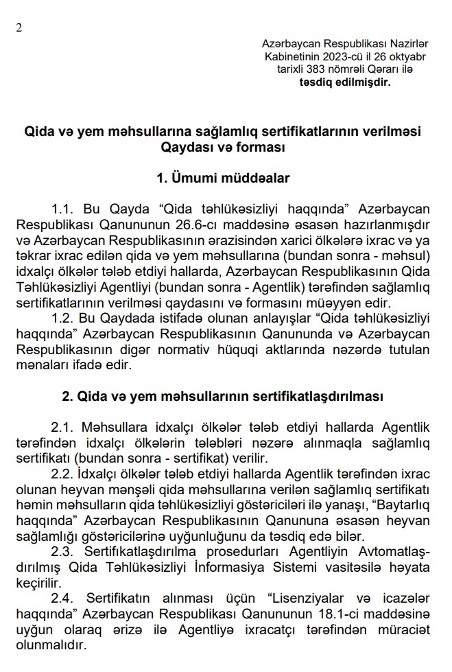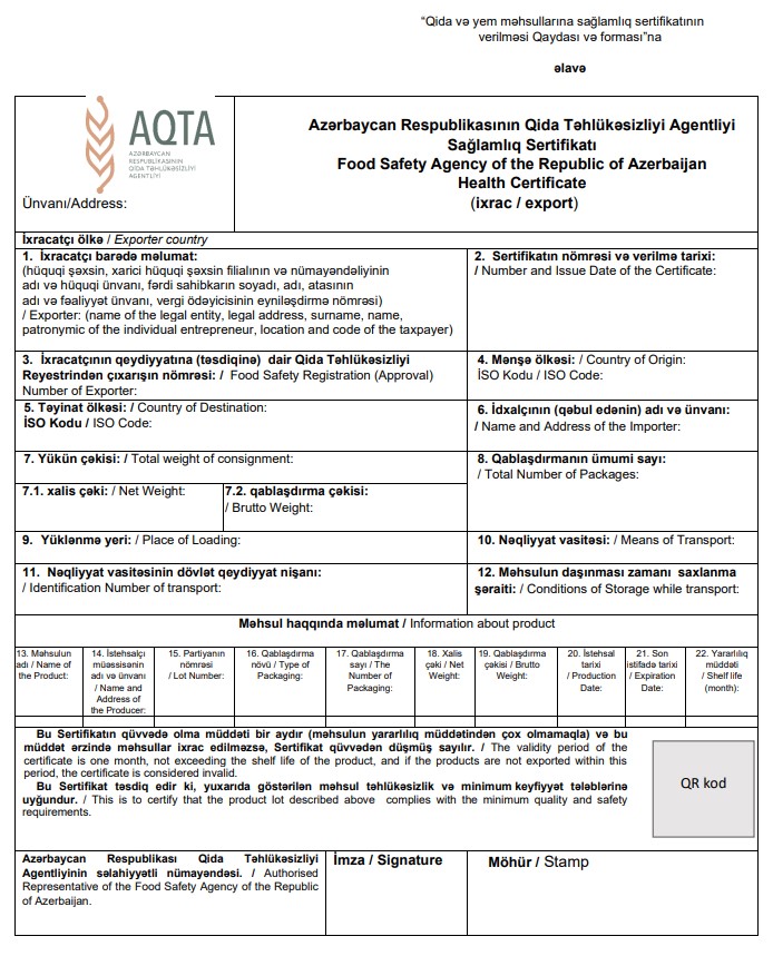 Qaydaya görə, məhsullara idxalçı ölkələr tələb etdiyi hallarda Azərbaycan Qida Təhlükəsizliyi Agentliyi tərəfindən idxalçı ölkələrin tələbləri nəzərə alınmaqla sağlamlıq sertifikatı verilir. İdxalçı ölkələr tələb etdiyi hallarda Agentlik tərəfindən ixrac olunan heyvan mənşəli qida məhsullarına verilən sağlamlıq sertifikatı həmin məhsulların qida təhlükəsizliyi göstəriciləri ilə yanaşı, “Baytarlıq haqqında” Azərbaycan Respublikasının Qanununa əsasən heyvan sağlamlığı göstəricilərinə uyğunluğunu da təsdiq edə bilər.