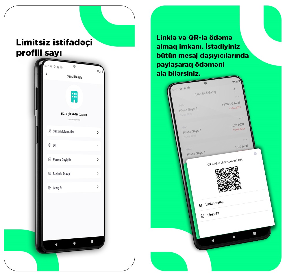 - Ödəniş linklərinizi və yaxud QR ödənişlərinizi yaratmaq və paylaşmaq