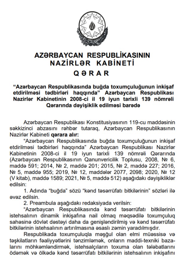 Dəyişikliyə əsasən, Kənd Təsərrüfatı Nazirliyinin toxum istehsal edən elmi müəssisə və təşkilatları tərəfindən Nazirlər Kabinetinin təsdiq etdiyi kvota əsasında istehsal edilən elit toxumlar istehsal xərclərinin 70 faizindən yuxarı olmayan qiymətə toxumçuluq təsərrüfatlarına satılır və əldə edilən vəsait həmin elmi müəssisə və təşkilatların işçilərinin sosial müdafiəsinin və maddi-texniki bazasının gücləndirilməsinə yönəldiləcək.