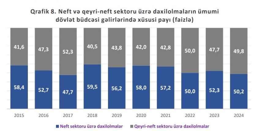2024-cü ildə vergi və gömrük orqanlarının xətti ilə dövlət büdcəsinin qeyri-neft gəlirlərinin 88,2 faizini və ya 13 milyard 929 milyon manatını vergi gəlirləri, 11,8 faizini və ya 1 milyard 861 milyon manatını qeyri-vergi gəlirləri təşkil edir.