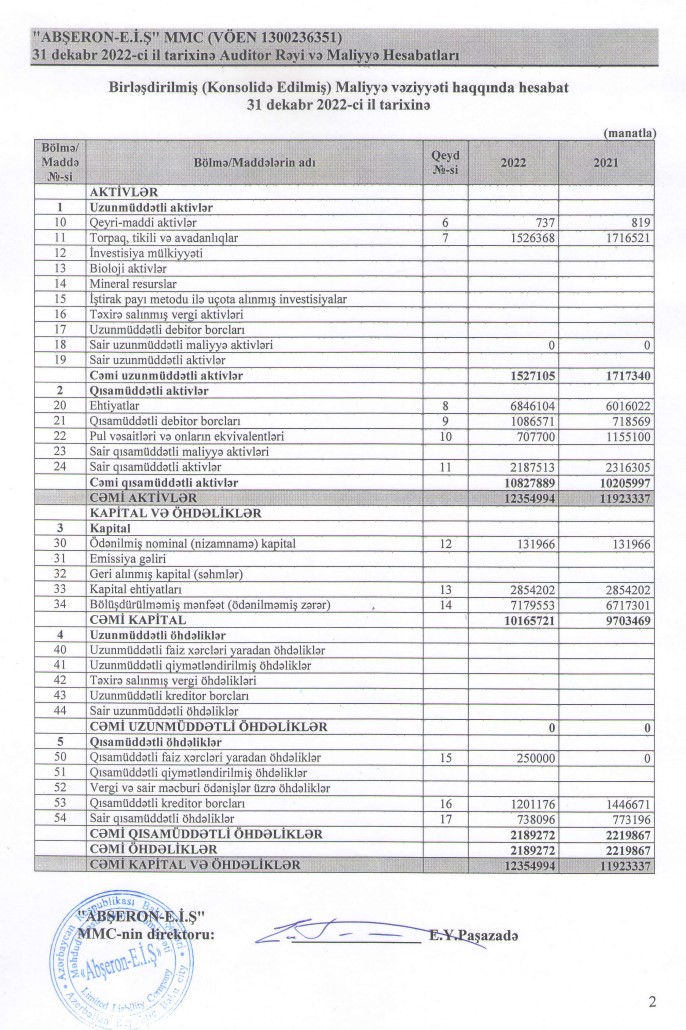 31 dekabr 2022-ci il tarixində "Аbşeron elm-istehsalat müəssisəsi"MMC-ninaktivləri 12 milyon 355 milyon manat olub ki, bu da illik müqayisədə 3,6 % çoxdur.