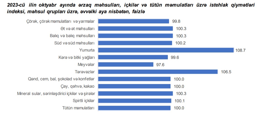 2023-cü ilin oktyabr ayında ərzaq məhsulları, içkilər və tütün məmulatları üzrə istehlak qiymətləri indeksi əvvəlki aya nisbətən 0,8 faiz, əvvəlki ilin oktyabr ayına nisbətən 3,1 faiz artıb.