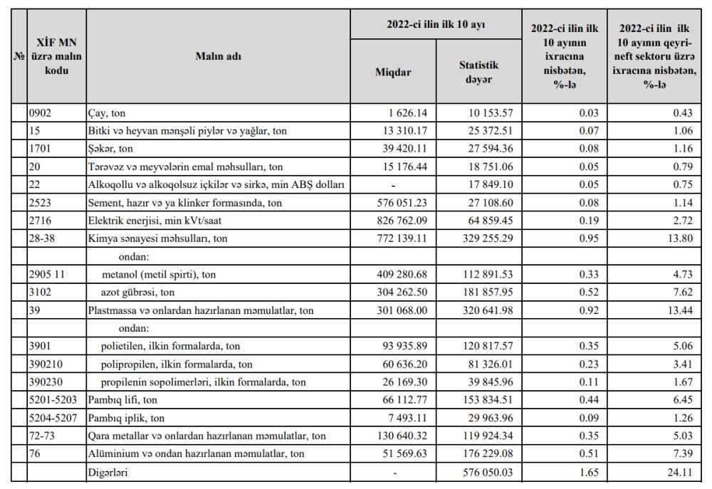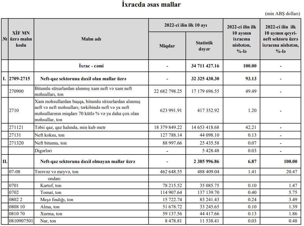 2022-ci ilin ilk 10 ayı ərzində Azərbaycanın 34 milyard 711 milyon 427 min dollarlıq ixracının 32 milyard 325 milyon 430 min dolları və ya 93,13%-i neft-qaz sektoruna daxil olan mallar üzrə olmuşdu.