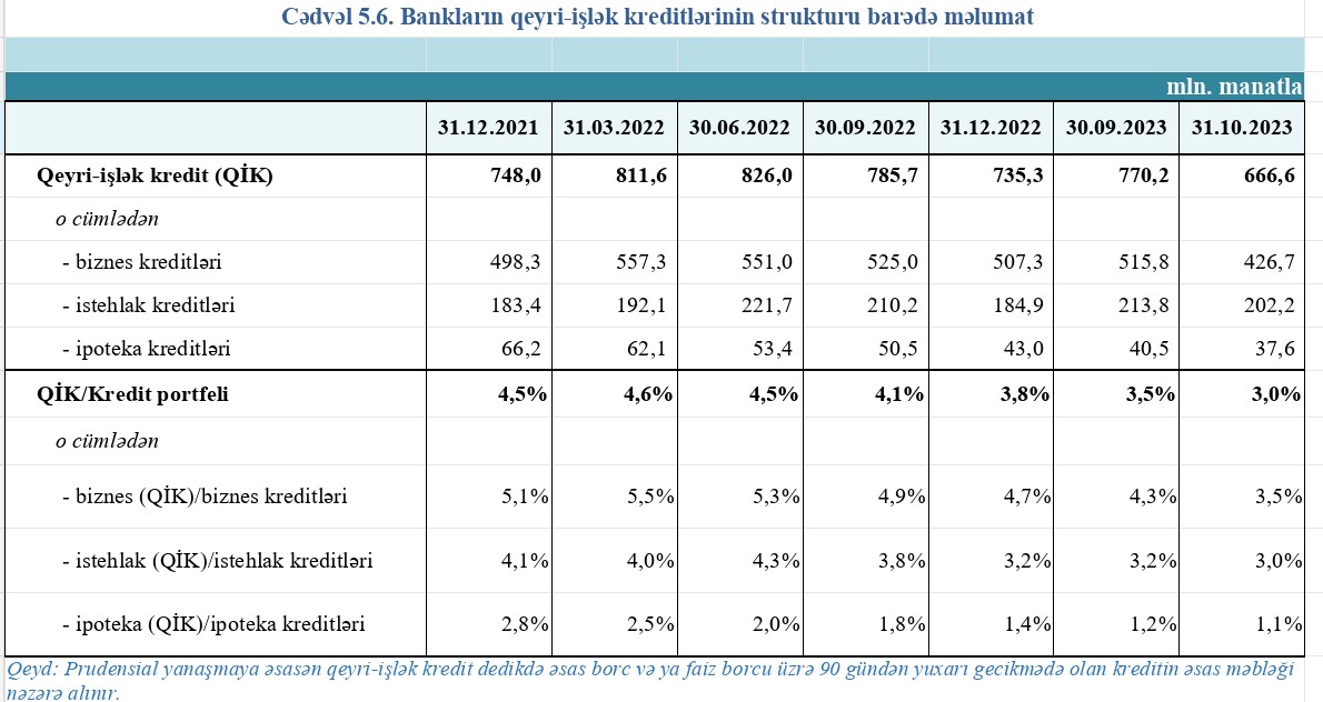 Marja.az-ın Mərkəzi Bankın aylıq statistikasına əsasən apardığı hesablamaya görə, 31 oktyabr 2023-cü il tarixində bankların 22 milyard 459 milyon 711 min manat cəmi kredit portfelinin 666,6 milyon manatını və ya 3%-ni qeyri-işlək kreditlər təşkil edib. Sentyabrın sonunda bankların cəmi kredit portfeli 22 milyard 281 milyon 880 min manat, qeyri-işlək kreditlərin məbləği 770,2 milyon manat (3,5%) təşkil etmişdi.