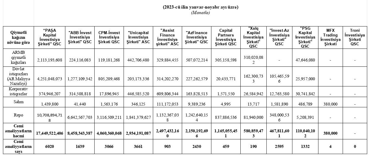 Marja.az Birjaya istinadən xəbər verir ki, 2023-cü ilin yanvar-noyabr dövründə “PAŞA Kapital İnvestisiya Şirkəti” QSC 17 milyard 449 miylon 522 in manat dövriyyə ilə 1-ci, "ABB İnvest İnvestisiya Şirkəti" QSC 8 milyard 458 milyon 343 min manat dövriyyə ilə 2-ci, CPM-İnvest İnvestisiya Şirkəti QSC 4 milyard 60 milyon 360 min manat dövriyyə ilə 3-cü yeri tutub.