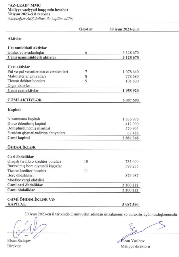 30 İyun 2023-cü il tarixində "Az-Lead" MMC 5 milyon 87 min dollar cəmi aktivlərə malik olub. Şirkət 2022-ci ilin sonunda 5 milyon 943 min dollar cəmi aktivlərə malik idi.