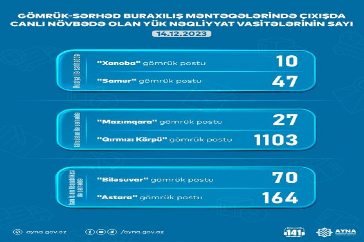 Marja-nın AYNA-ya istinadən xəbərinə görə, gömrük-sərhəd məntəqələrində çıxışda gözləmədə olan nəqliyyat vasitələrinin sayı barədə məlumata əsasən, “Astara” gömrük postunda 164, “Biləsuvar” gömrük postunda 70, “Qırmızı Körpü” gömrük postunda 1103, “Mazımqara” gömrük postunda 27, “Samur” gömrük postunda 47 və “Xanoba” gömrük postunda 10 yük maşını var.