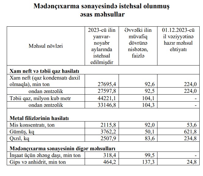 2023-cü ilin yanvar-noyabr aylarında Azərbaycanda 2 min 507,9 kq qızıl istehsal edilib.
