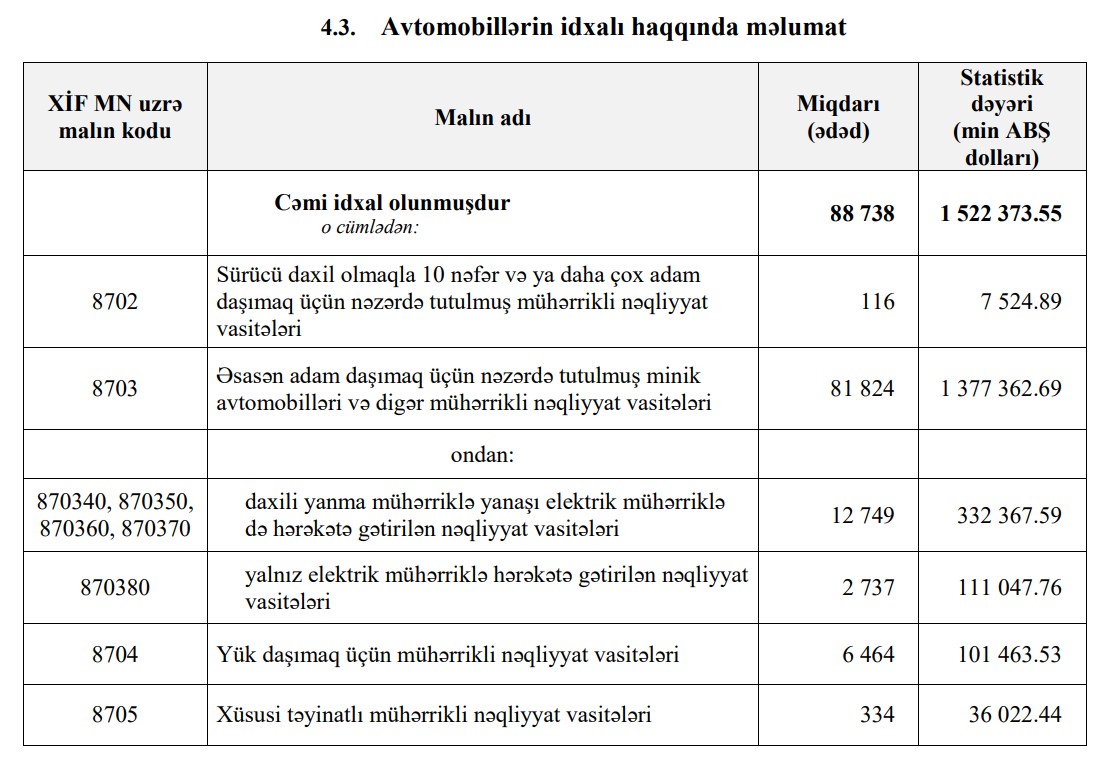 2023-cü ilin yanvar-noyabr dövründə (11 ayda) Azərbaycana 1 milyard 522 milyon 373 min dollar dəyərində 88 min 738 ədəd nəqliyyat vasitəsi (avtomobil) idxal olunub.
