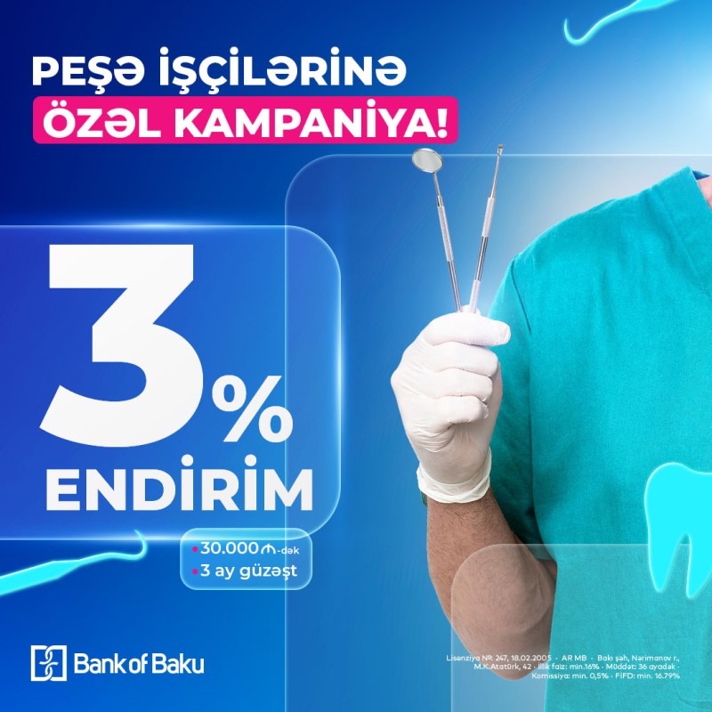 Bank of Baku-dan peşə sahiblərinə özəl TƏKLİF: 3% ENDİRİM + 3 AY GÜZƏŞT