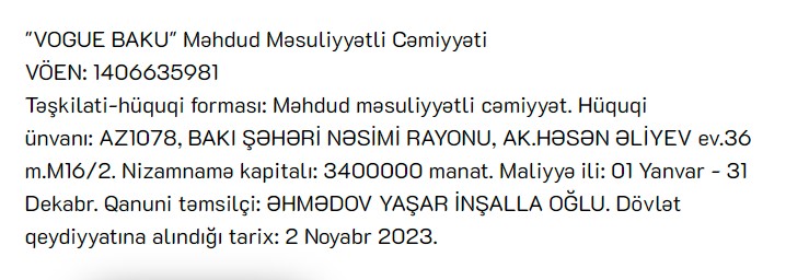 "Vogue Baku" MMC-nin hüquqi ünvanı Bakı şəhəri, Nəsimi rayonu, Ak.Həsən Əliyev ev.36-dır.