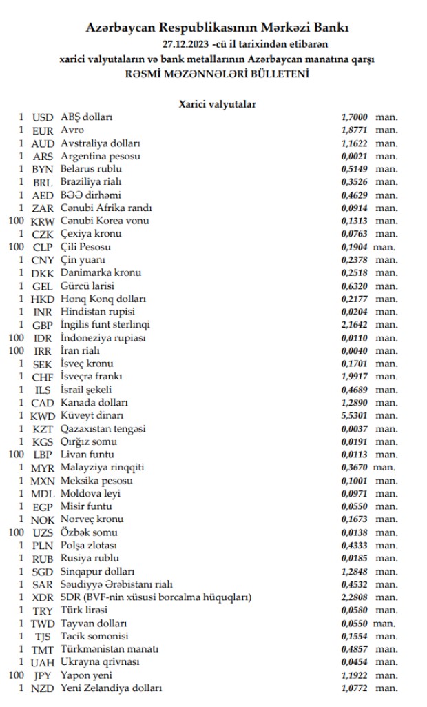 Rəsmi məzənnələr açıqlandı