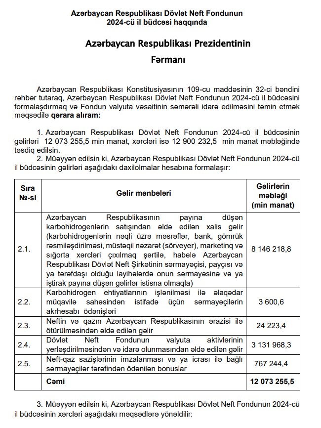 Azərbaycan Respublikasının Prezidenti İlham Əliyev "Azərbaycan Respublikası Dövlət Neft Fondunun 2024-cü il büdcəsi haqqında" Fərman imzalayıb.