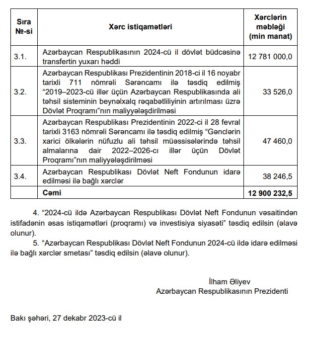 Həmçinin “2024-cü ildə Azərbaycan Respublikası Dövlət Neft Fondunun vəsaitindən istifadənin əsas istiqamətləri (proqramı) və investisiya siyasəti” və “Azərbaycan Respublikası Dövlət Neft Fondunun 2024-cü ildə idarə edilməsi ilə bağlı xərclər smetası” təsdiq edilib.