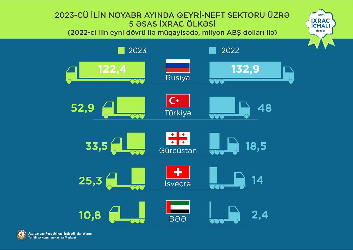 2023-cü ilin noyabr ayında qeyri-neft sektoruna aid ən çox mal ixrac edilən ölkələrin siyahısında Rusiya Federasiyası (122,4 milyon ABŞ dolları) birinciliyə yüksəlib. Bu siyahıda Türkiyə (52,9 milyon ABŞ dolları) ikinci və Gürcüstan (33,5 milyon ABŞ dolları) üçüncü olub.