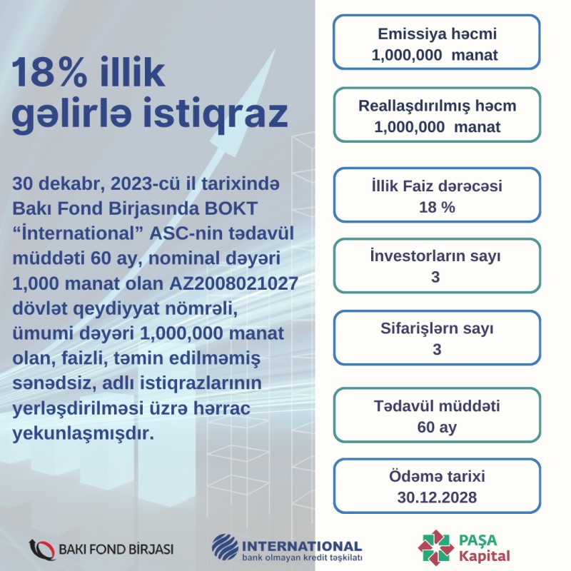 BOKT “İnternational”ın istiqrazlarına 3 investor 3 sifariş təqdim edib - HƏRRACIN NƏTİCƏSİ