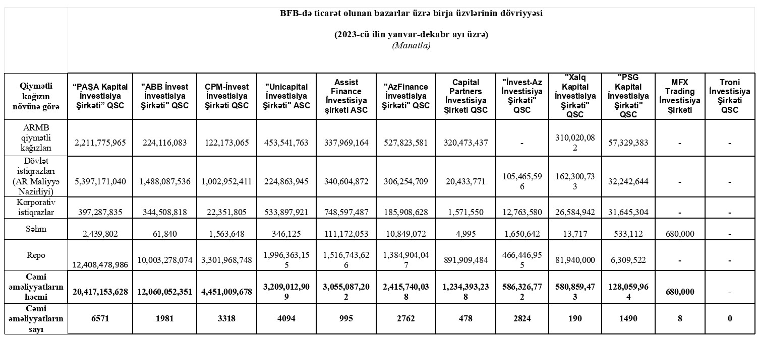 Marja.az Birjaya istinadən xəbər verir ki, 2023-cü ildə “PAŞA Kapital İnvestisiya Şirkəti” 20 milyard 417 milyon 154 min manat dövriyyə ilə 1-ci, "ABB İnvest İnvestisiya Şirkəti" 12 milyard 60 min manat dövriyyə ilə 2-ci və "CPM-İnvest İnvestisiya Şirkəti" 4 milyard 451 milyon 10 min manat dövriyyə ilə 3-cü olub.
