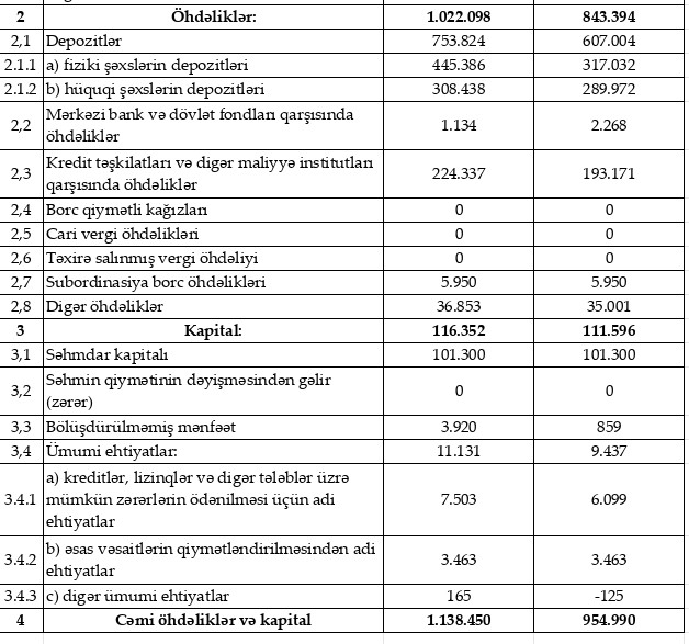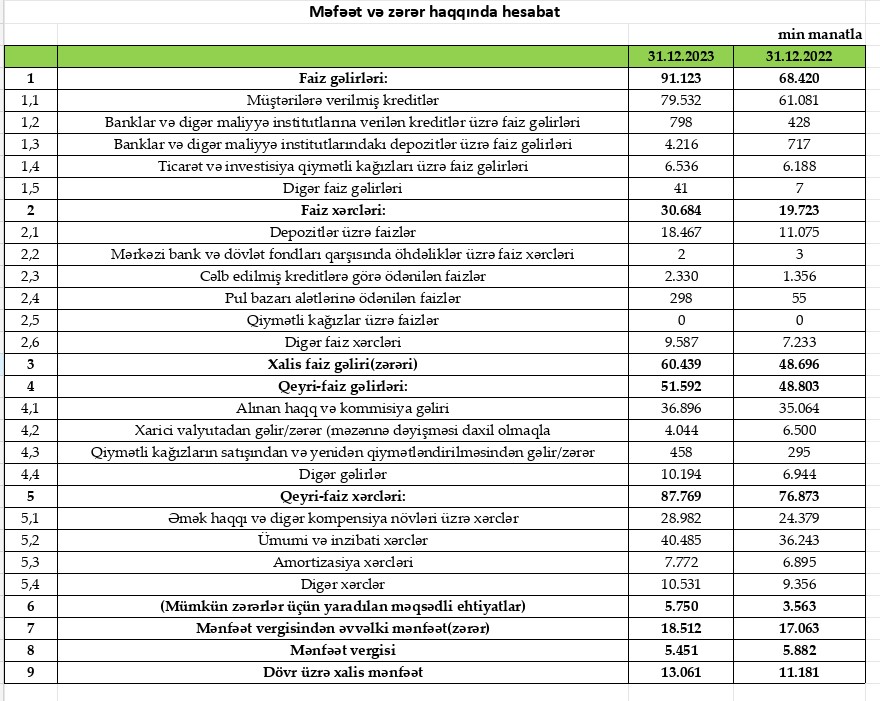 Müqayisə üçün qeyd edək ki, 2022-ci ildə "Rabitəbank"ın cəmi əməliyyat gəlirləri 117 milyon 223 min manat, cəmi əməliyyat xərcləri 96 milyon 596 min manat, əməliyyat mənfəəti 20 milyon 627 min manat təşkil etmişdi. Bank əməliyyat mənfəətindən 3 milyon 562 min manat mümkün zərərlər üçün yaradılan məqsədli ehtiyatlara ayırmış, 5 milyon 882 min manat mənfəət vergisi ödəmişdi.