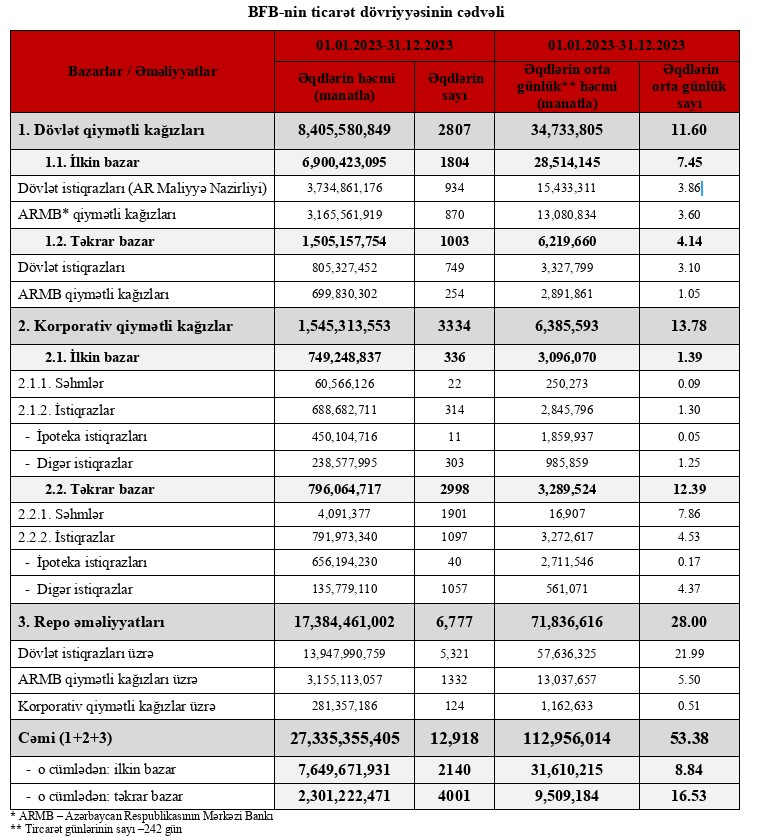 2023-cü ildə dövlət istiqrazları ilə repo əməliyyatlarının həcmi 10 milyard 406 milyon 847 min manat və ya təxminən 4 dəfə artaraq 13 milyard 947 milyon 991 min manat təşkil edib. 2022-ci ildə dövlət istiqrazları ilə repo əməliyyatlarının həcmi 3 milyard 541 milyon 144 min manat olmuşdu.