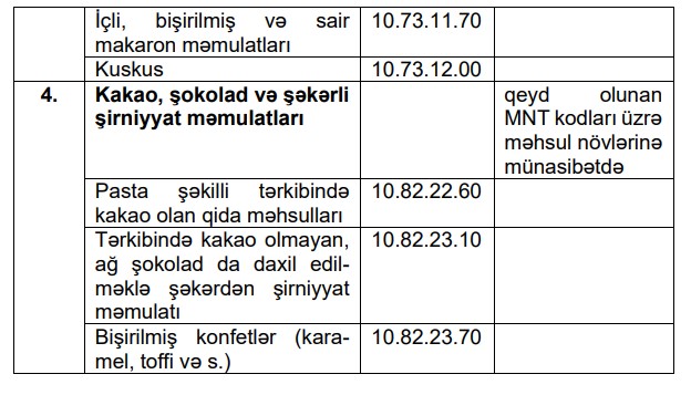 Qeyd edilib ki, Siyahı qida (ərzaq) məhsullarının xammalından istifadə edərək həmin xammal üzərində istehsal (emal) əməliyyatlarını həyata keçirməklə qida (ərzaq) məhsularının istehsalını (emalını) həyata keçirən vergi ödəyicilərinə şamil olunur.