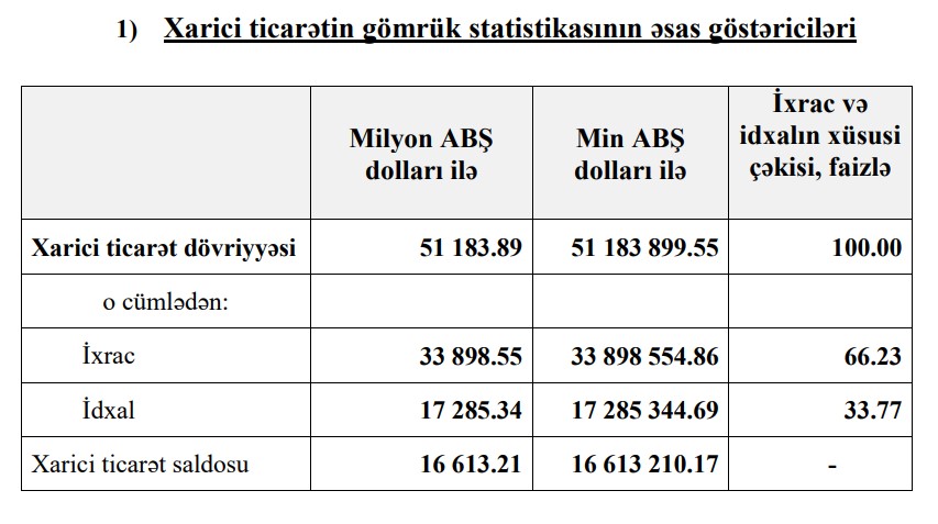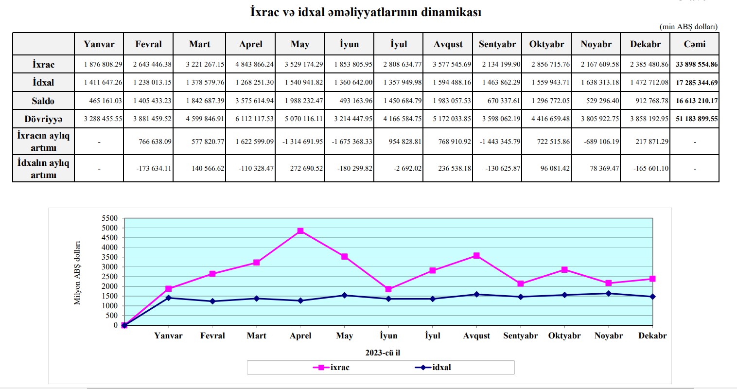 Müqayisə üçün qeyd edək ki, 2022-ci ildə Azərbaycanın xarici ticarət dövriyyəsi 52 milyard 686 milyon 488 min dollar, o cümlədən ixrac 38 milyard 146 milyon 630 min dollar, idxal 14 milyard 539 milyon 858 min dollar, saldo 23 milyard 606 milyon 771 min dollar təşkil etmişdi.