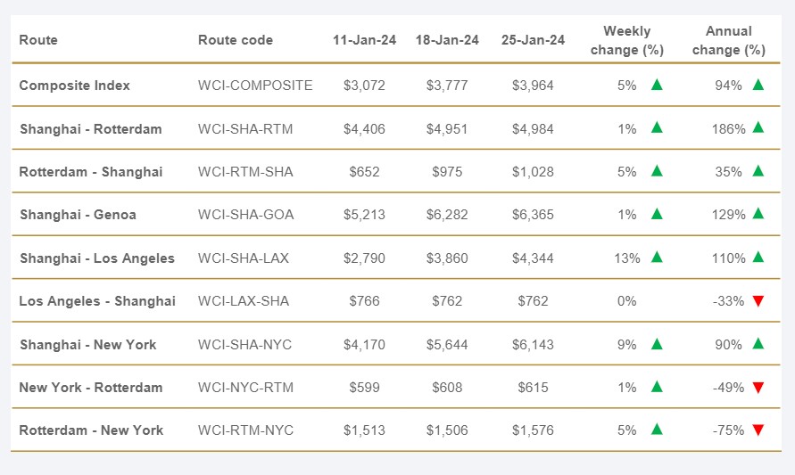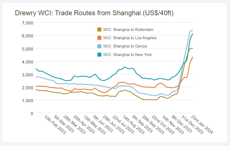 Qırmızı dənizdəki geosiyasi gərginlik səbəbindən yükdaşıma qiymətləri 8 həftədir artmaqdadır. Drewry-nin World Container Index-də verilən məlumata görə, 40-lıq konteyner üçün qiymət noyabrın 30-da 1382 dollar səviyyəsində ikən, yanvarın 25-də isə 3964 dollara çatıb. Drewry's World Container Index bu həftə 5% artıb.Qırmızı dənizdə gərginlik yükdaşıma qiymətlərini artırıb.