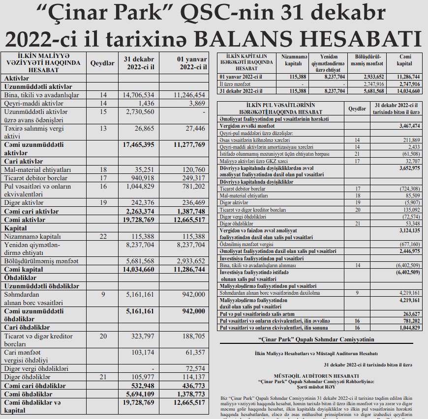 31 dekabr 2022-ci il tarixində "Çinar Park" QSC 19 milyon 729 min manat cəmi aktivlərə malik olub. Şirkıt 2021-ci ilin sonunda 12 milyon 666 min manat cəmi aktivlərə malik idi.