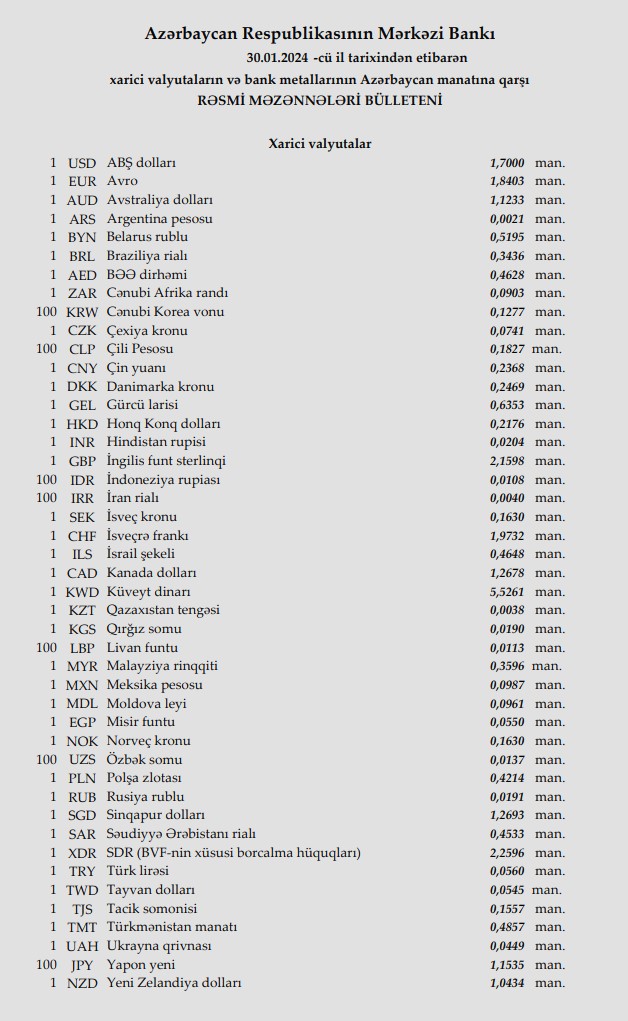 Rəsmi məzənnələr açıqlandı