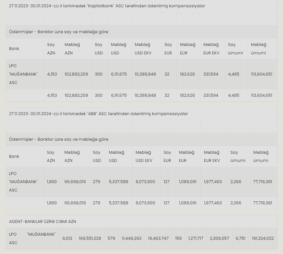 Hər iki agent bank tərəfindən ləğvetmə prosesində olan "Muğanbank" ASC-nin 6 min 751 əmanətçisinə 191 milyon 324 min 32 manat kompensasiya ödənilib.