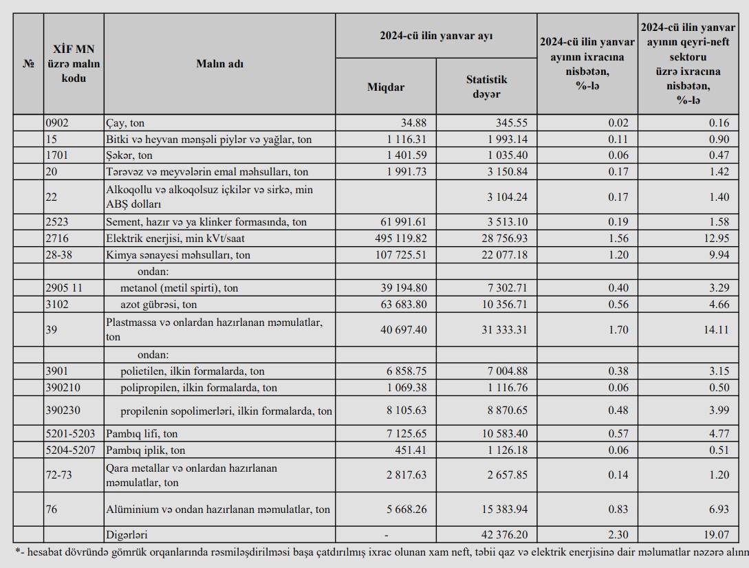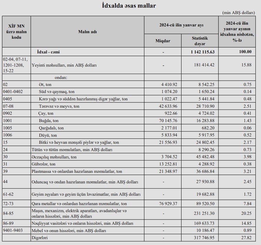2024-cü ilin yanvar ayında Azərbaycanın ən çox ixrac və idxal etdiyi mallar.
