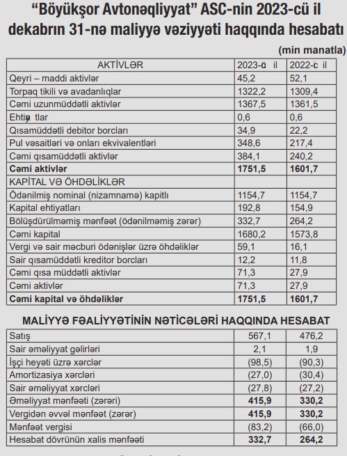 31 dekabr 2023-cü il tarixində “Böyükşor Avtonəqliyyat” ASC 1 milyon 751, 5 min manat cəmi aktivlərə malik olub (2022-ci ilin sonunda 1 milyon 601,7 min manat).