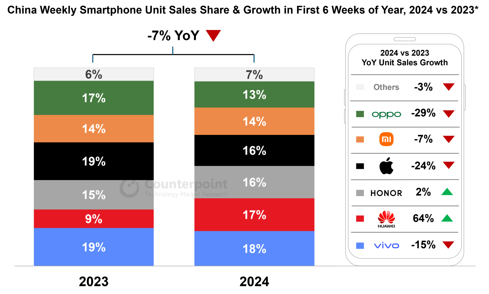 2024-cü ilin ilk altı həftəsində Apple-ın Çində satışları illik müqayisədə 24% azalıb, Huawei-nin satışları isə eyni dövrdə 64% artıb. Apple-ın Çin bazarındakı payı 16%-dən aşağı düşüb, brend populyarlıqda dördüncü yerə geriləyib, Huawei 16,5%-lik payla ikinci yerə yüksəlib.