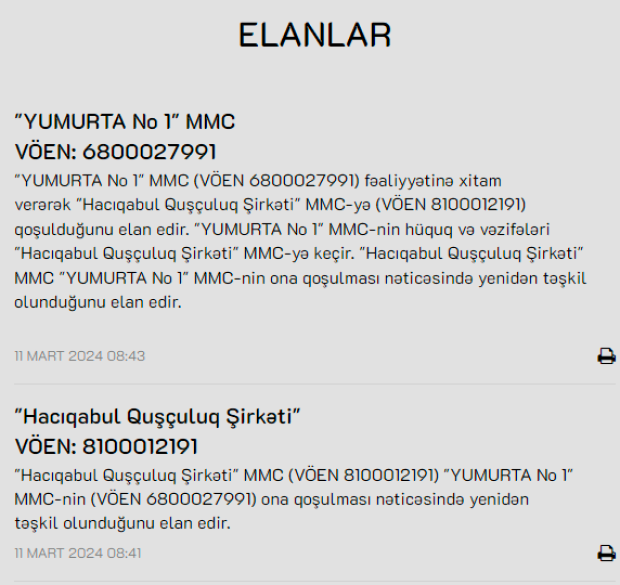 "YUMURTA No 1" MMC isə fəaliyyətinə xitam verərək "Hacıqabul Quşçuluq Şirkəti" MMC-yə qoşulduğunu elan edib. "YUMURTA No 1" MMC-nin hüquq və vəzifələri "Hacıqabul Quşçuluq Şirkəti" MMC-yə keçir.