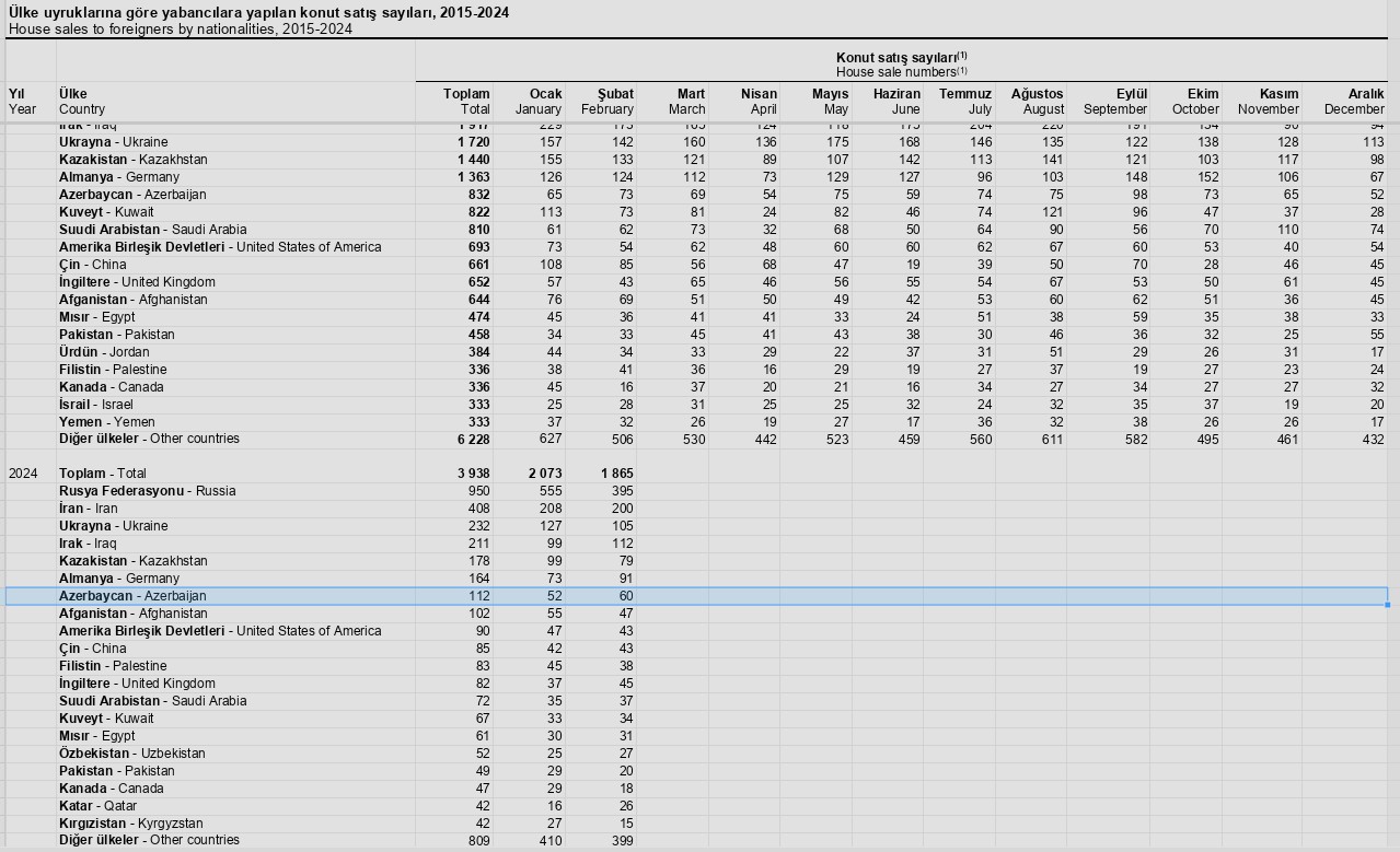 2024-cü ilin yanvar-fevral aylarında Azərbaycan vətəndaşları Türkiyədə 112 ev alıblar.