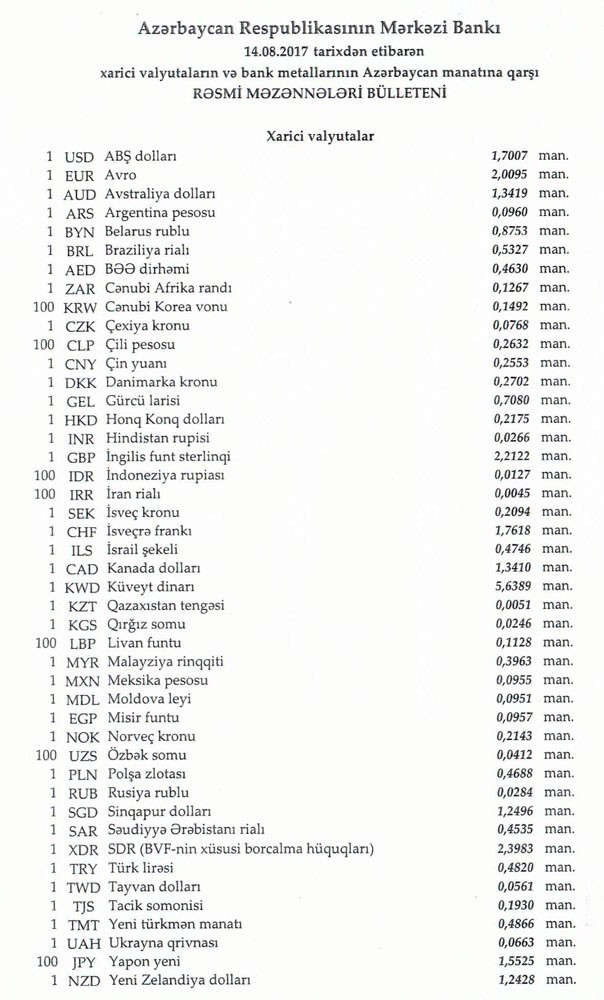 Avqustun 14-nə Mərkəzi Bankın açıqladığı rəsmi Dollar/manat məzənnəsi Avqustun 11-i ilə müqayisədə dəyişməyərək 1,7007 manat olub, Avro/manat məzənnəsi isə 2.0095 manata qalxıb.
