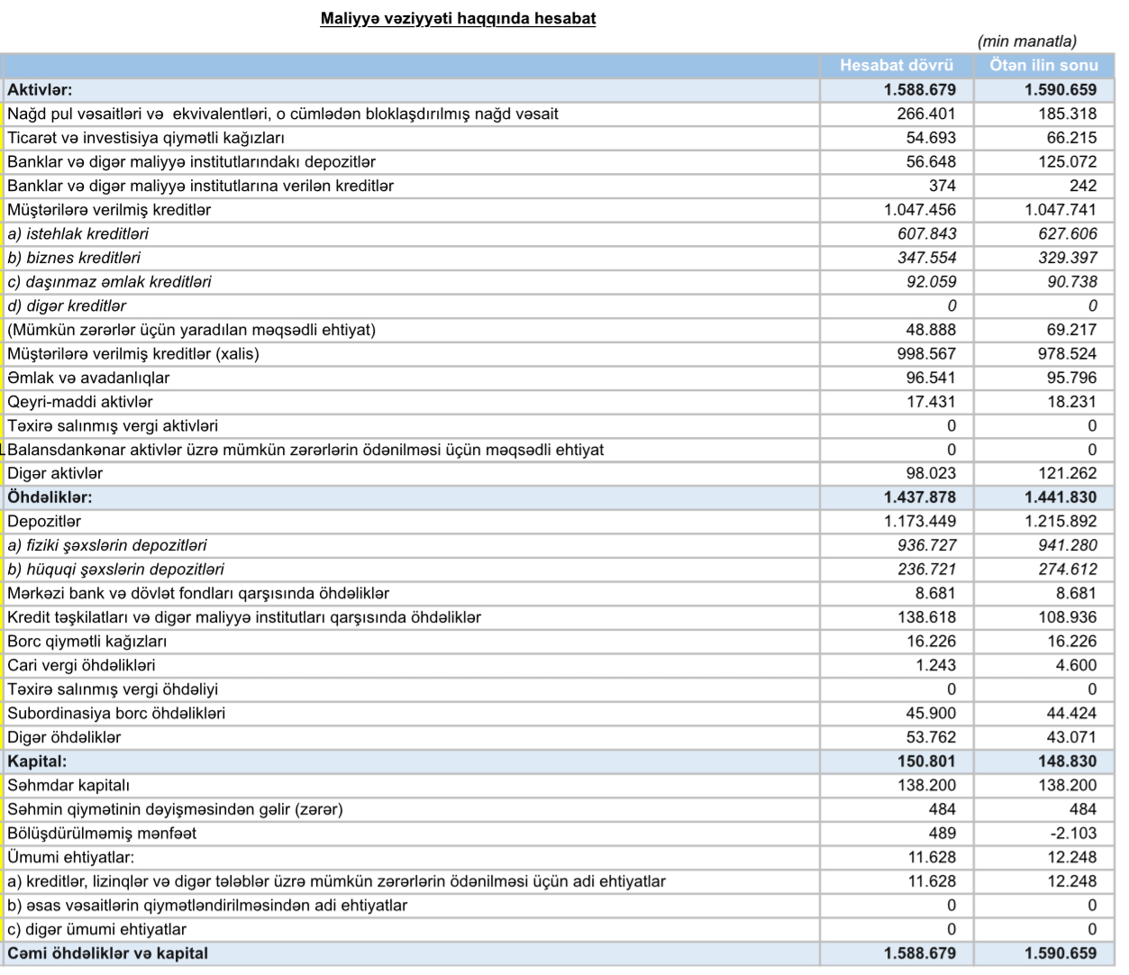 Dövr ərzində Bankın kapital mövqeyi xeyli güclənib. Hesabat dövründə Bankın məcmu kapitalı ötən ilin 1-ci rübü ilə müqayisədə 22.8 % artaraq, 164 milyon manat olub. 2024-cü ilin ilk 3 ayında Bank kapital adekvatlığını yüksəldib. Belə ki, ilin ilk rübünün sonuna bankın kapital adekvatlıq əmsalı artaraq, 13 %-ə yaxınlaşıb. Hesabat dövrünün sonuna bankın aktivləri 1 milyard 588 milyon manatı ötüb.