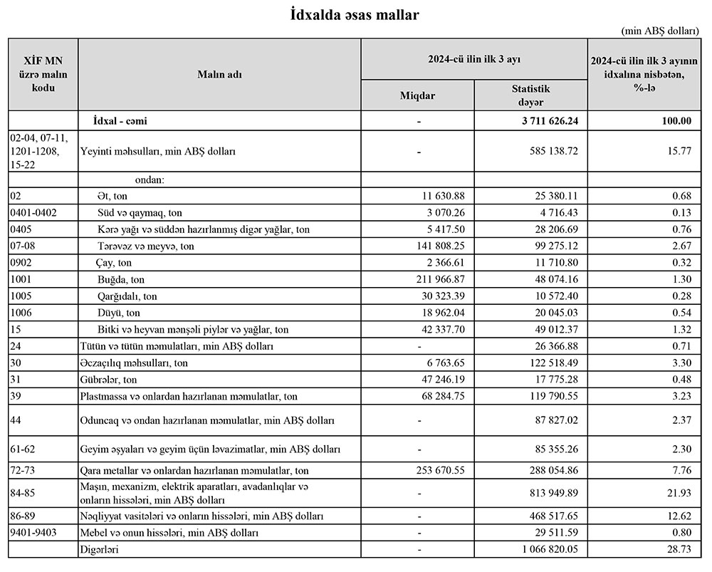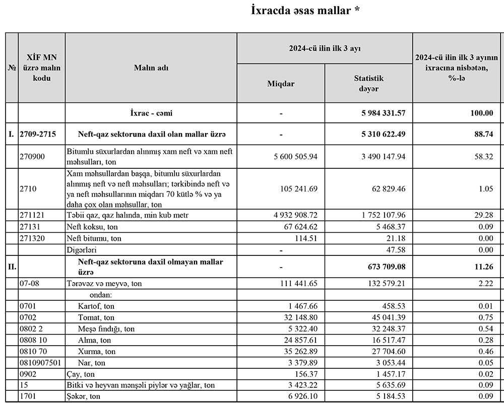 2024-cü ilin yanvar-mart aylarında (ilk 3 ayda) Azərbaycanın ən çox ixrac və idxal etdiyi mallar.