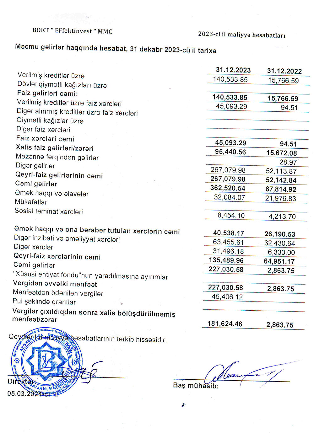 2023-cü ildə "Effektinvest"in cəmi gəlirləri 407 min 614 manat təşkil edib (2022-ci ildə 67 min 909 manat).