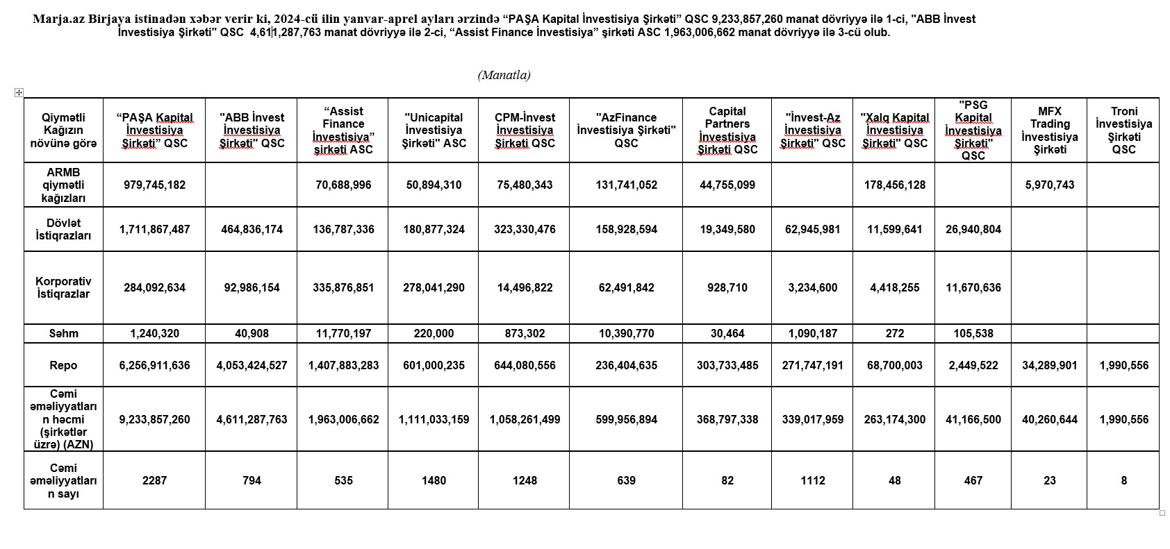 Marja.az Birjaya istinadən xəbər verir ki, 2024-cü ilin yanvar-aprel ayları ərzində “PAŞA Kapital İnvestisiya Şirkəti” QSC 9 milyard 233 milyon 857 min manat dövriyyə ilə 1-ci, "ABB İnvest İnvestisiya Şirkəti" QSC 4 milyard 611 milyon 288 min manat dövriyyə ilə 2-ci, “Assist Finance İnvestisiya” şirkəti ASC 1 milyard 963 milyon 7 min manat dövriyyə ilə 3-cü, "Unicapital İnvestisiya Şirkəti" ASC 1 milyard 111 milyon 33 min manat dövriyyə ilə 4-cü, "CPM-İnvest İnvestisiya Şirkəti"QSC 1 milyard 58 milyon 261 min manat dövriyyə ilə 5-ci olub.