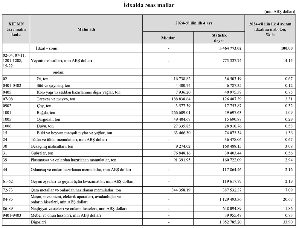 2024-cü ilin yanvar-aprel aylarında (ilk 4ayda) Azərbaycanın ən çox ixrac və idxal etdiyi mallar.