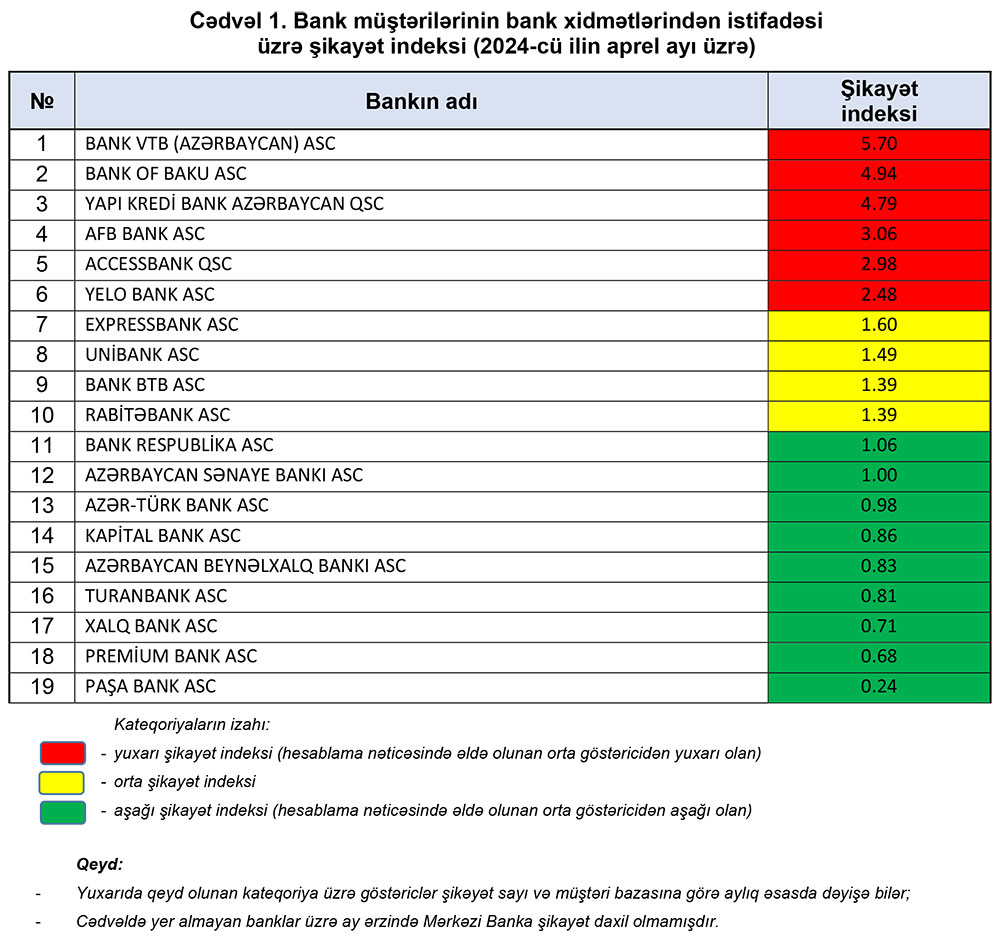 Orta şikayət indeksində isə EXPRESSBANK ASC, UNİBANK ASC, BANK BTB ASC, RABİTƏBANK ASC yer tutublar.