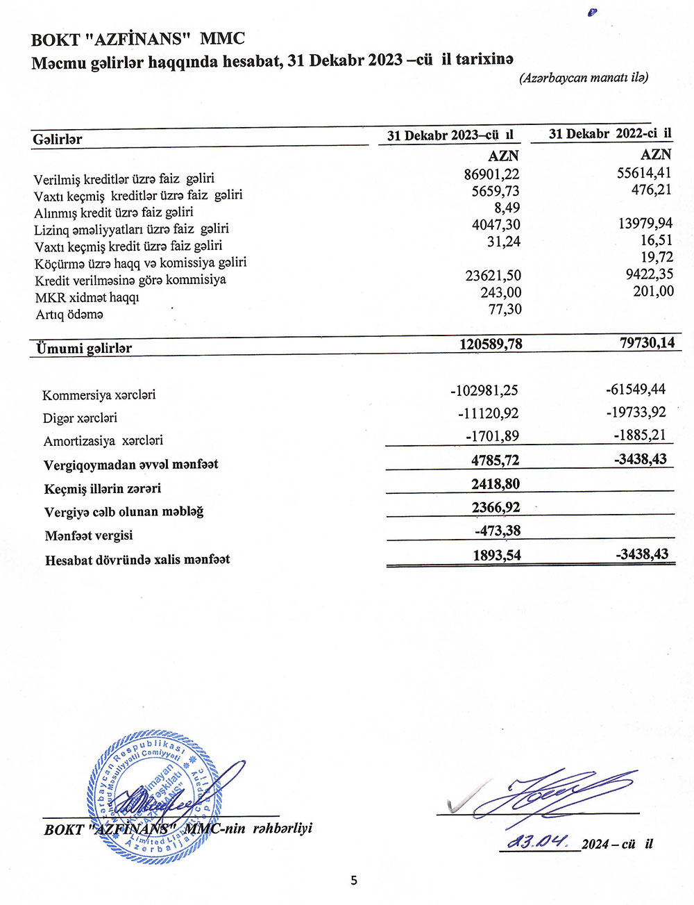 BOKT "AzFinans" MMC 2023-cü ili 1894 manat xalis mənfəət ilə başa vurub. Təşkilat 2022-ci ili 3 min 438 manat xalis zərər ilə bağlamışdı.