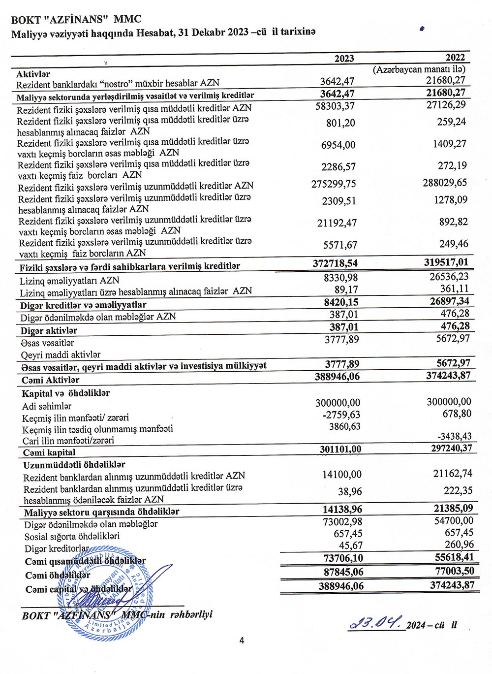 Ötən il "AzFinans" tərəfindən fiziki şəxslərə və fərdi sahibkarlara verilmiş cəmi kreditlər 16% artaraq 31 dekabr 2023-cü il tarixində 372 min 718 manata çatıb.