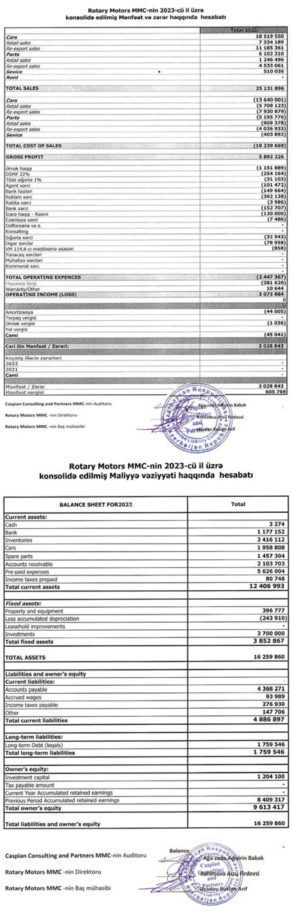 Ötən il “Rotary Motors”ın daxili bazarda pərakəndə satışları2 dəfə azalaraq 7 milyon 334 min manata düşüb. 2022-ci ildə Şirkətin daxili bazarda pərakəndə satışları 11 milyon 664 min manat təşkil etmişdi.