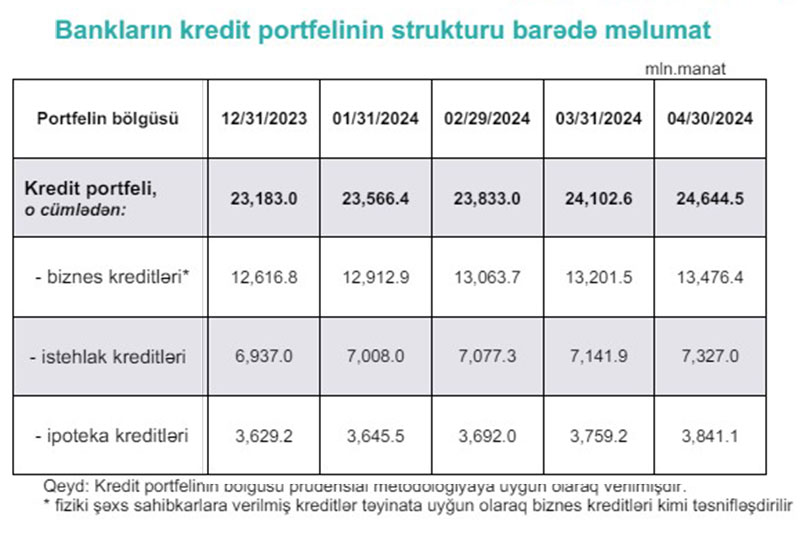 Aprel ayının sonunda cəmi kredit portfelinin 54.7%-ni və ya 13 milyard 476,4 milyon manatını biznes kreditləri, 29.7%-ni və ya 7 milyard 327 milyon manatını istehlak kreditləri, 15.6%-ni və ya 3 milyard 841,1 milyon manatını ipoteka kreditləri təşkil edib.